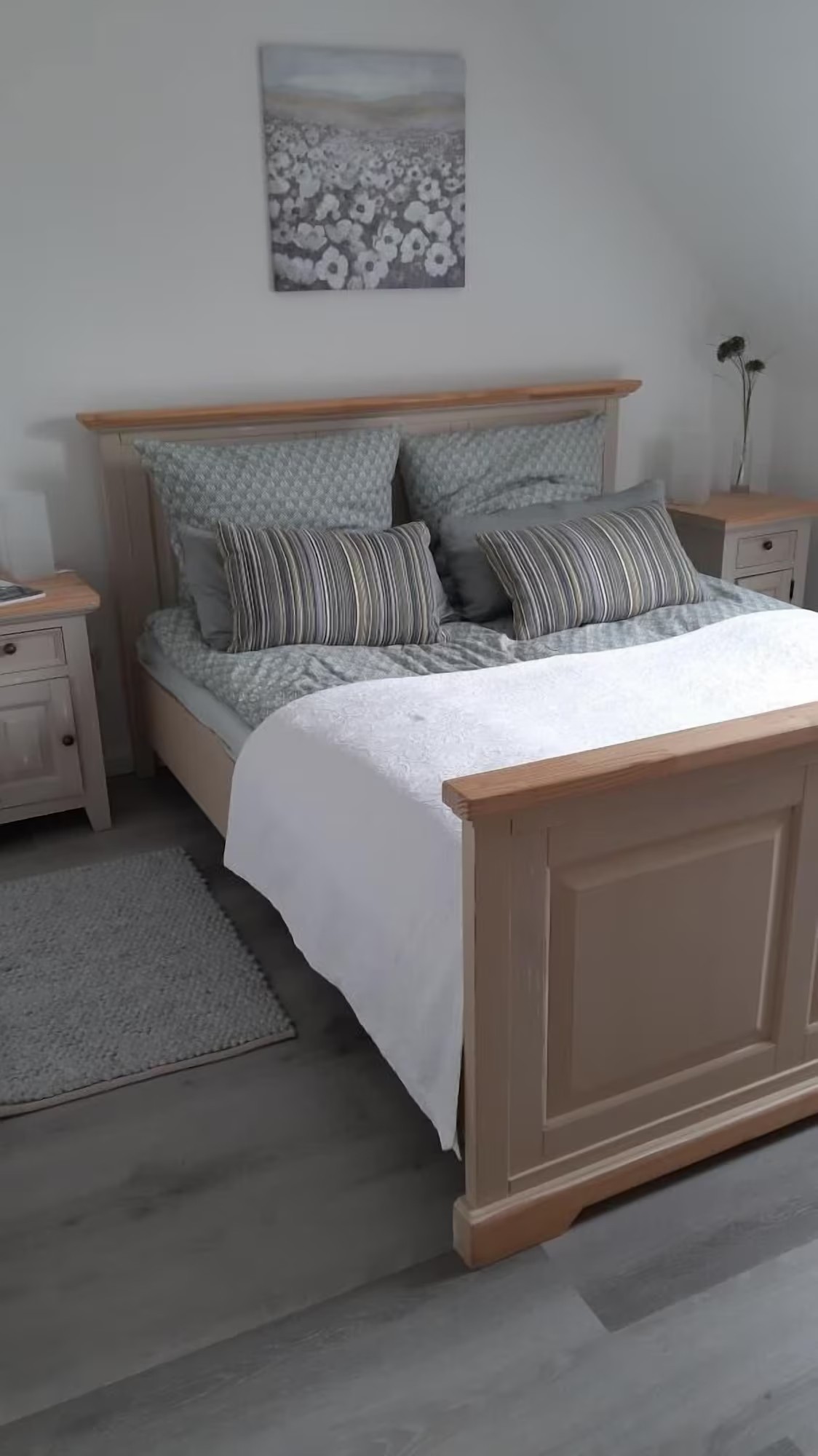 Unsere liebevoll eingerichtete Ferienwohnung bietet auf 45 qm alles, was Sie für einen erholsamen Aufenthalt benötigen. Das Schlafzimmer mit bequemen Doppelbett und das großzügige Badezimmer sorgen für höchsten Komfort. Im Wohn-Essbereich lädt ein gemütliches Sofa zum Entspannen ein, während die voll ausgestattete Küche keine Wünsche offenlässt.